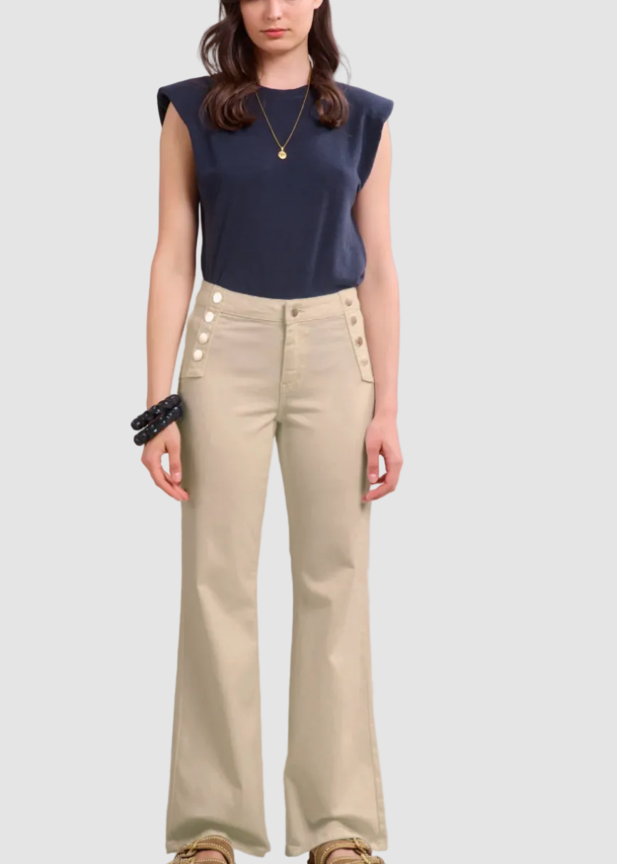 • Jean bootcut avec boutons décoratifs dorés apportant une touche tendance et originale